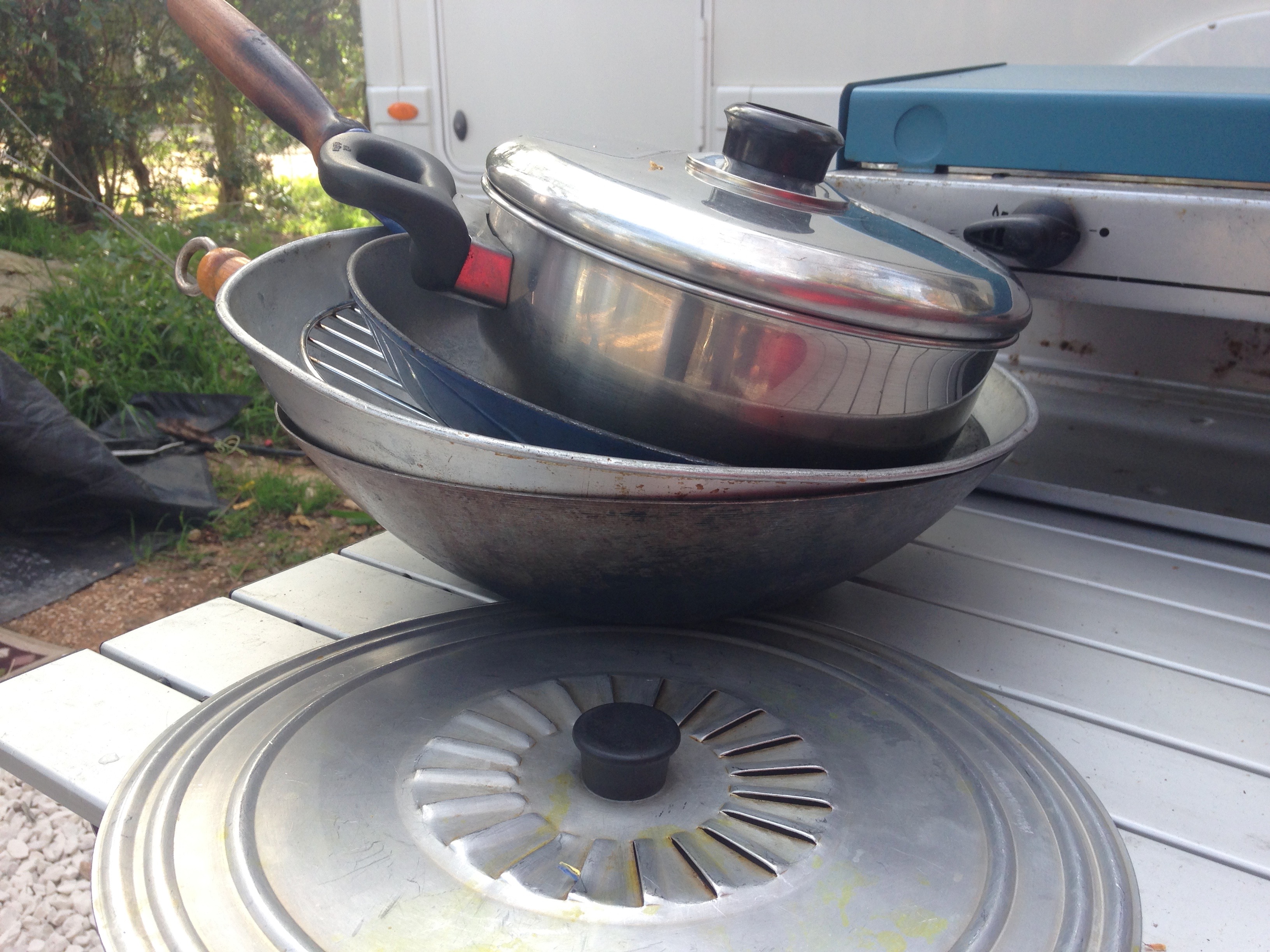 Your Basic Pan Kit: could be, a wok with lid, a cast iron pan (la Creuset is best dwarlinks- posh shops and charity shops are the places to hunt them down), a large lidded saucepan, a little lidded saucepan, a large chefs lid, a metal rack (from a bbq kit/cooling rack etc) and an electric kettle (wild camper? Hob top kettle).