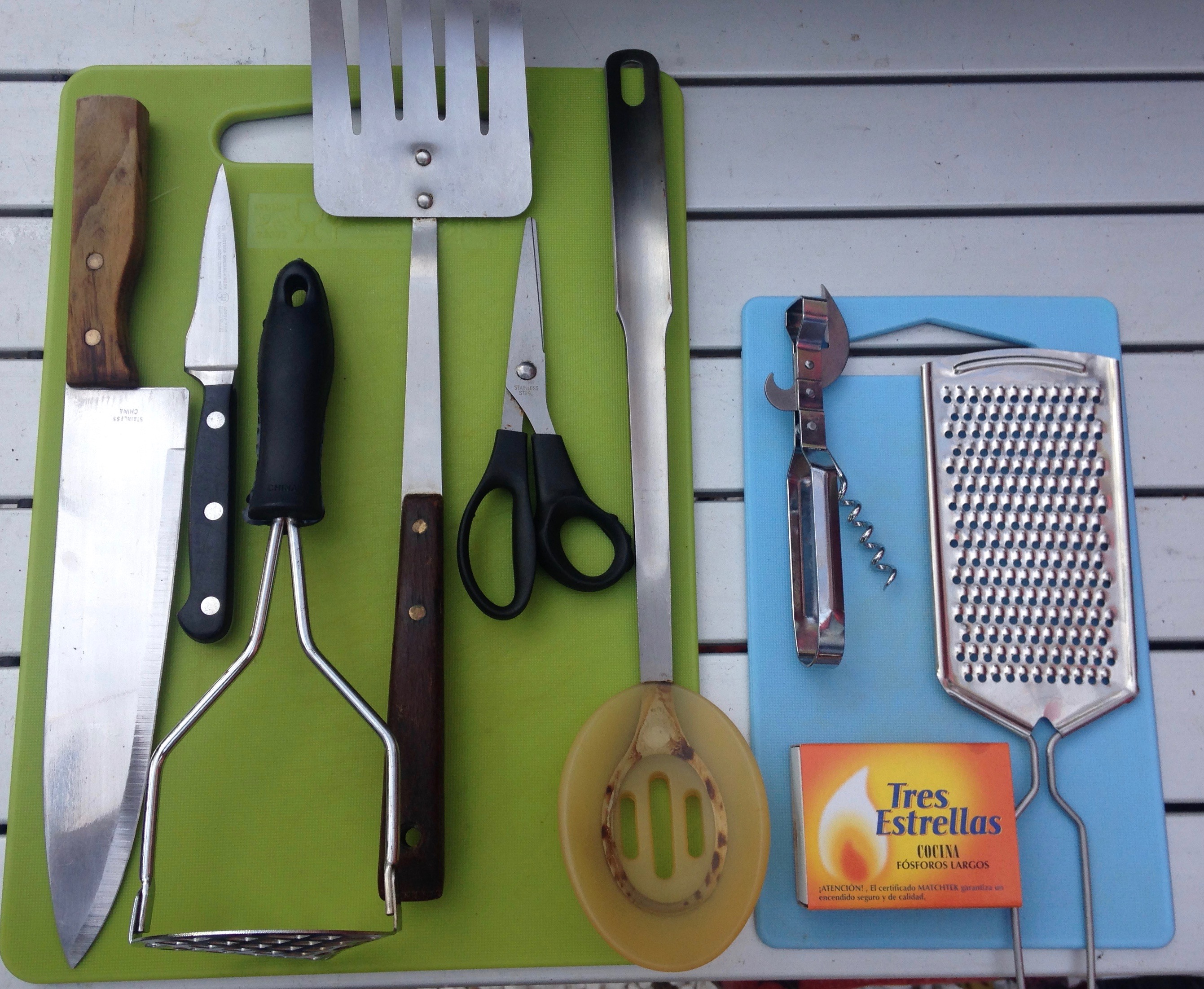Your Basic Cutlery Kit: 1 teaspoon, 1 tablespoon, 1 cup or mug (your drinkng mug will do), 1 large sharp knife, 1 small sharp knife, a couple of thin plastic chopping boards, a flat fine grater, large stirring and serving spoon, a good metal fish slice, a spud masher, a pair of scissors. With these things you and your camper van can take on the world.