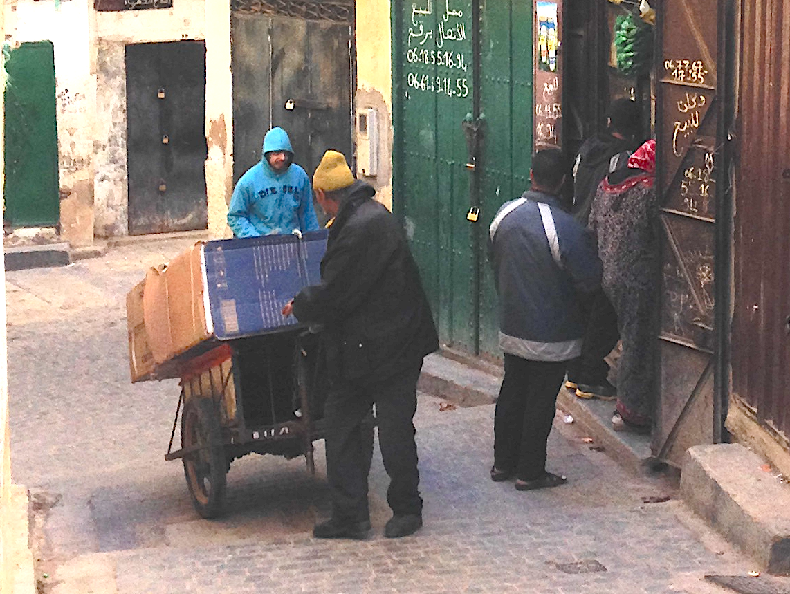 Handcarts and donkeys are the trucks of the Medina, steadfastly moving through the tightly crowded alleyways, stoically unfazed by the oppressive crush that is their daily lot.