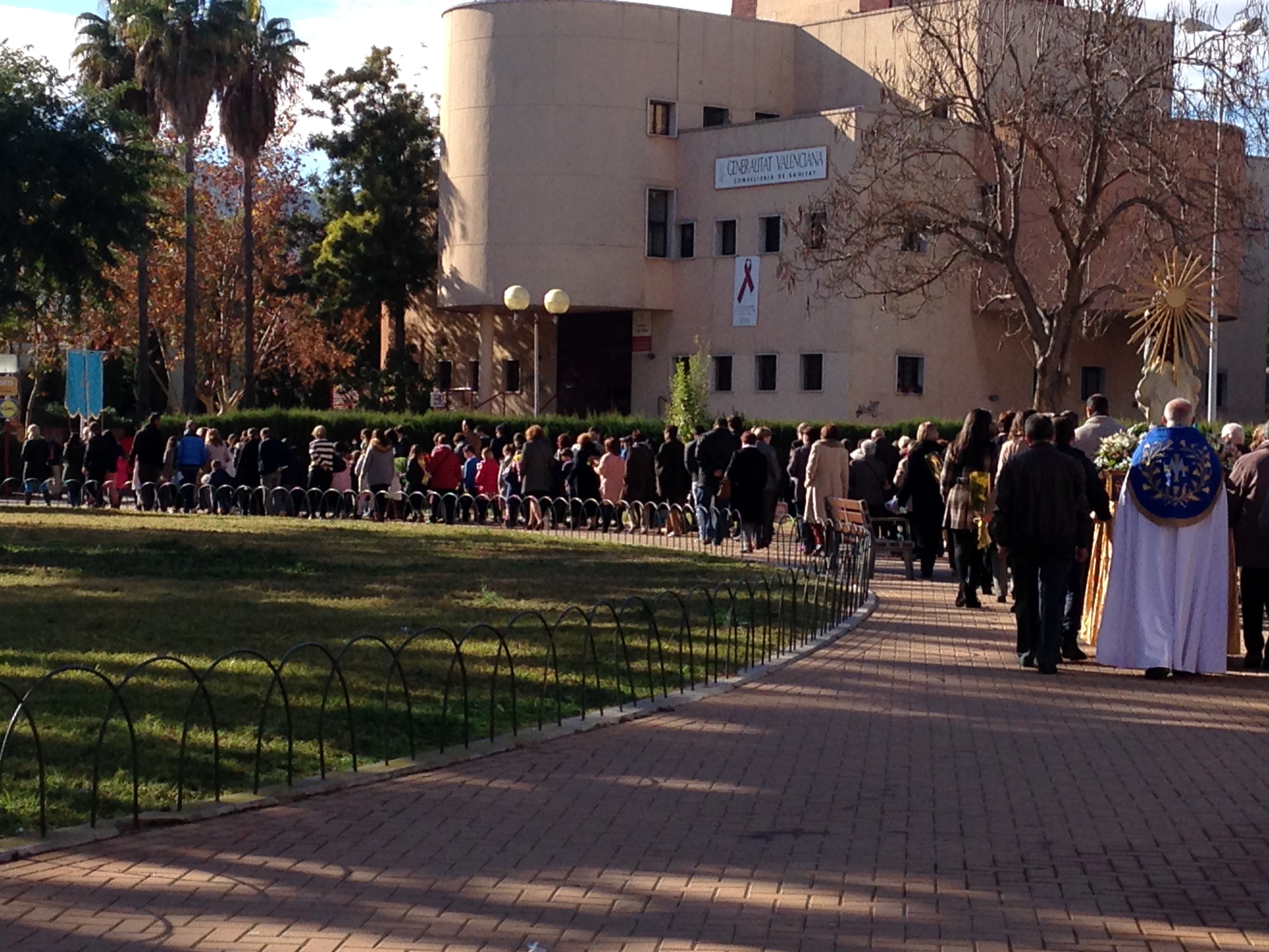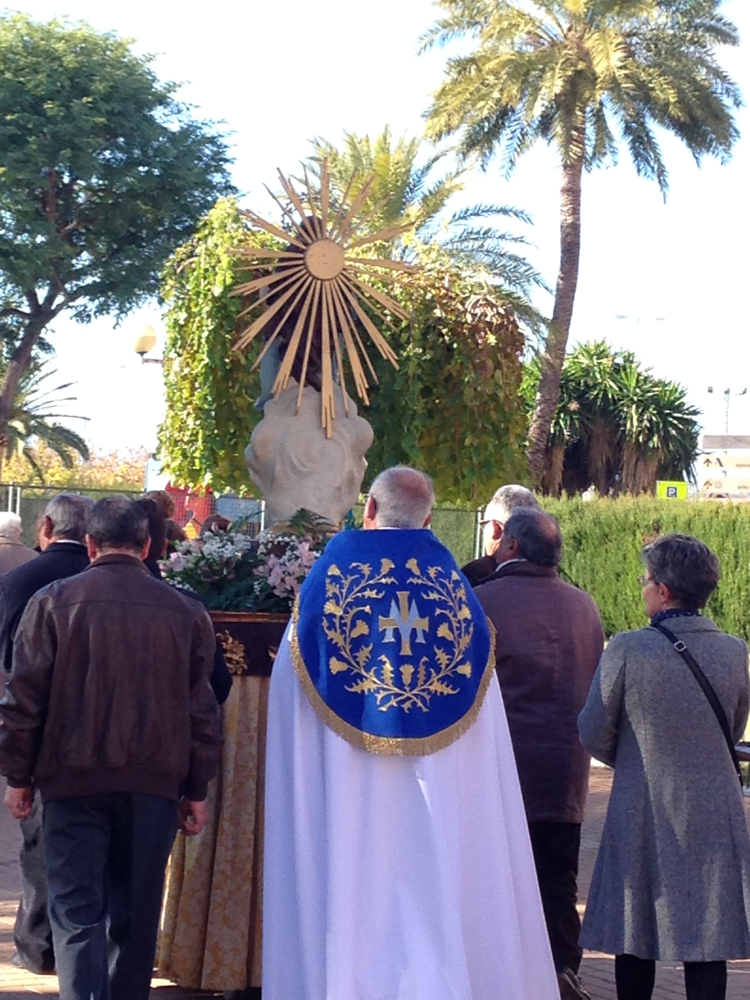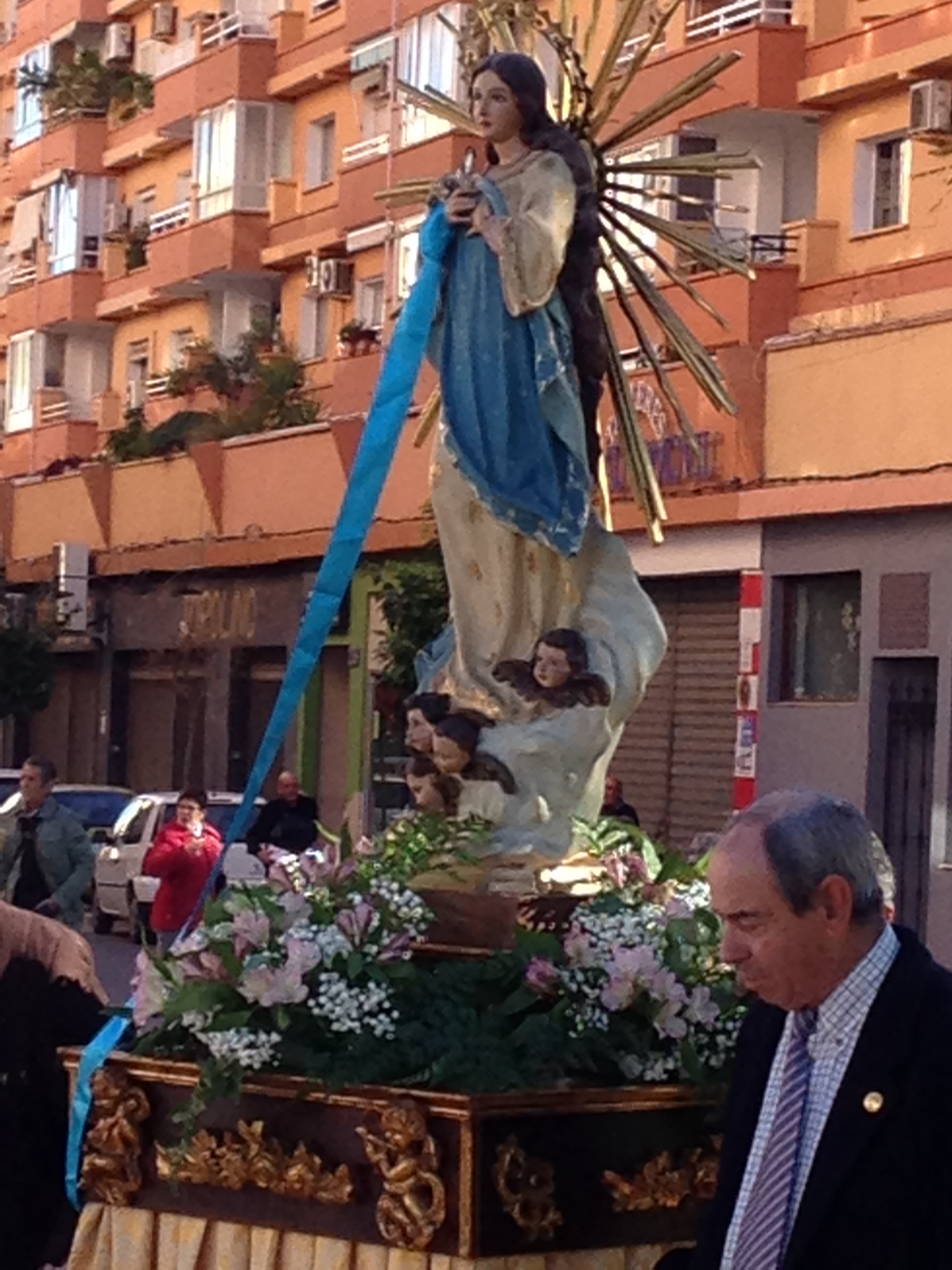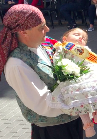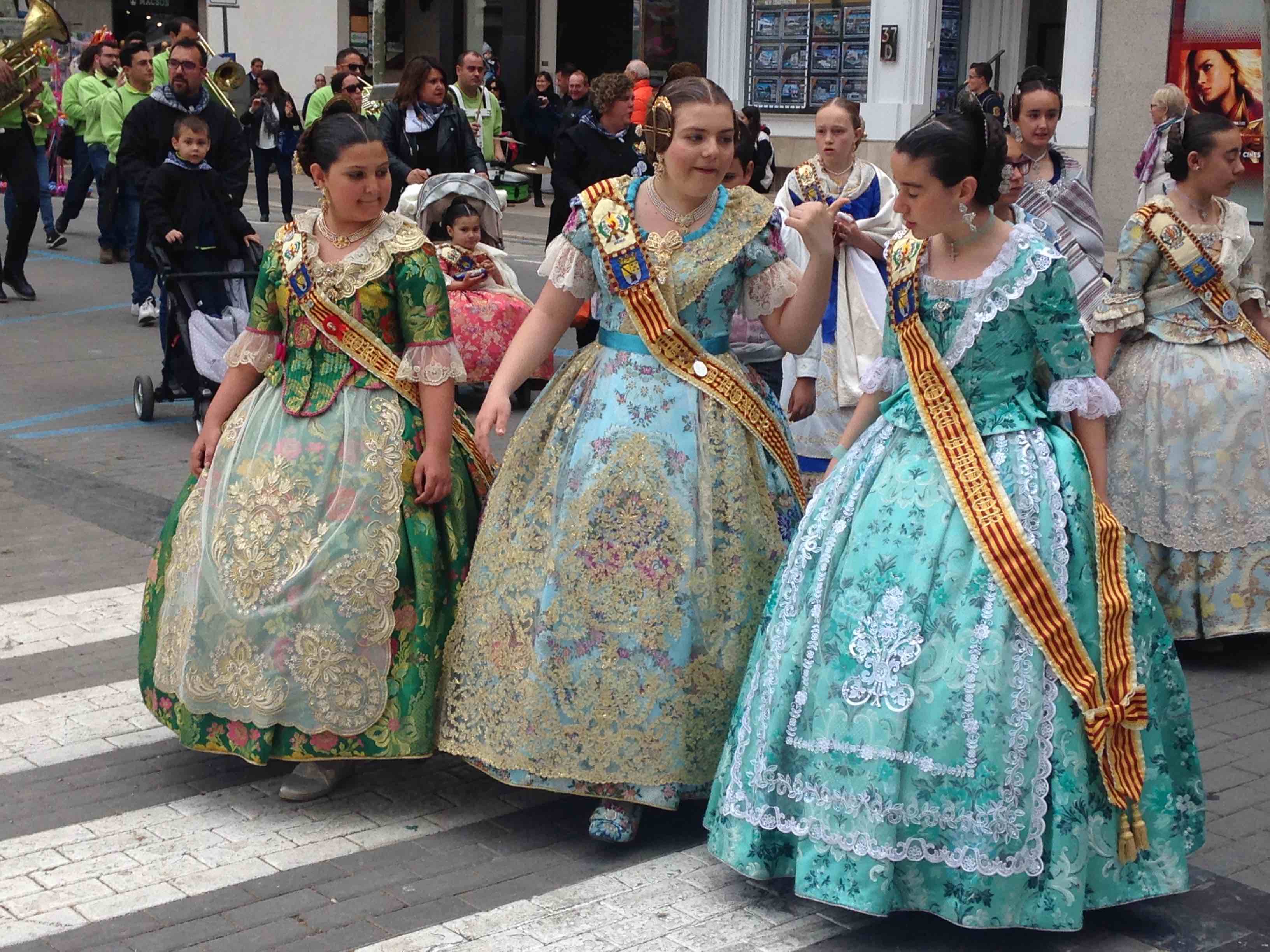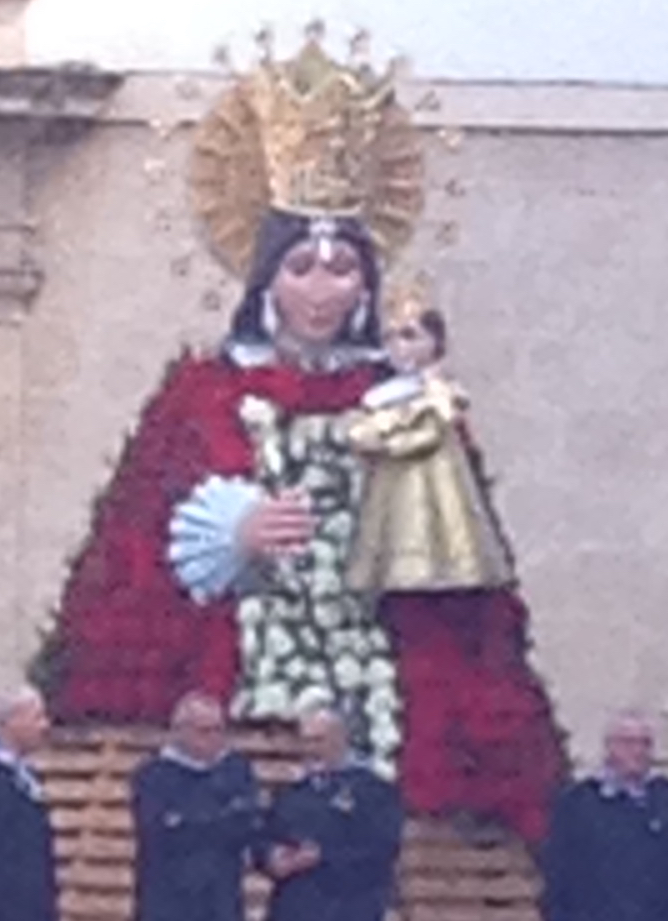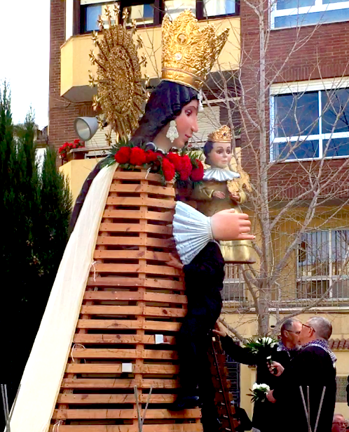 The ‘May Queen’ style event. Men and women, babies, girls and boys, all parade through every district of the town, passing each of the tableaux in turn. Once all the exhibits have been visited, each person then collects and carries a bunch of white or red carnations through the town centre. A wood framed Madonna, built outside a local church, is carefully, tenderly, stuffed with the bunches of carnations by the processions of Fallas participants. These people must walk miles during this progress.