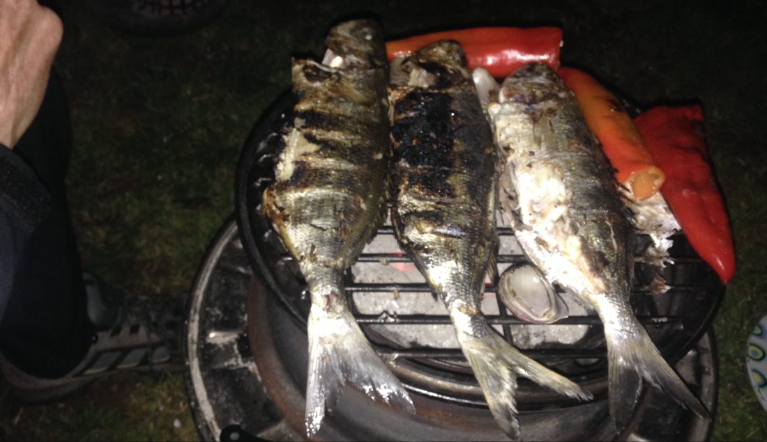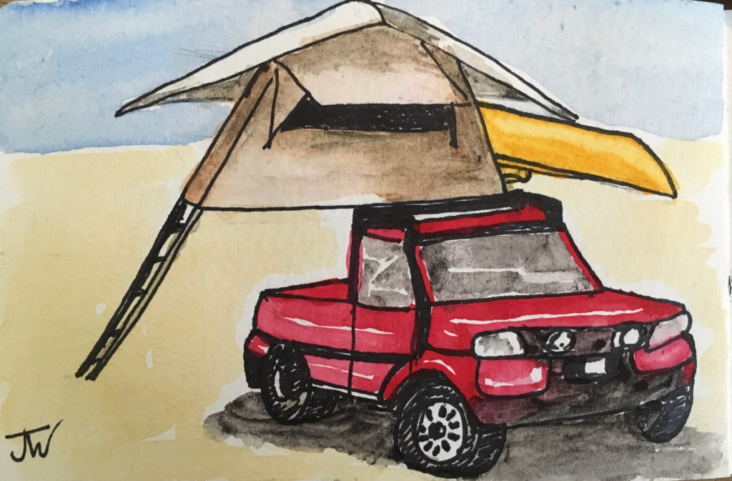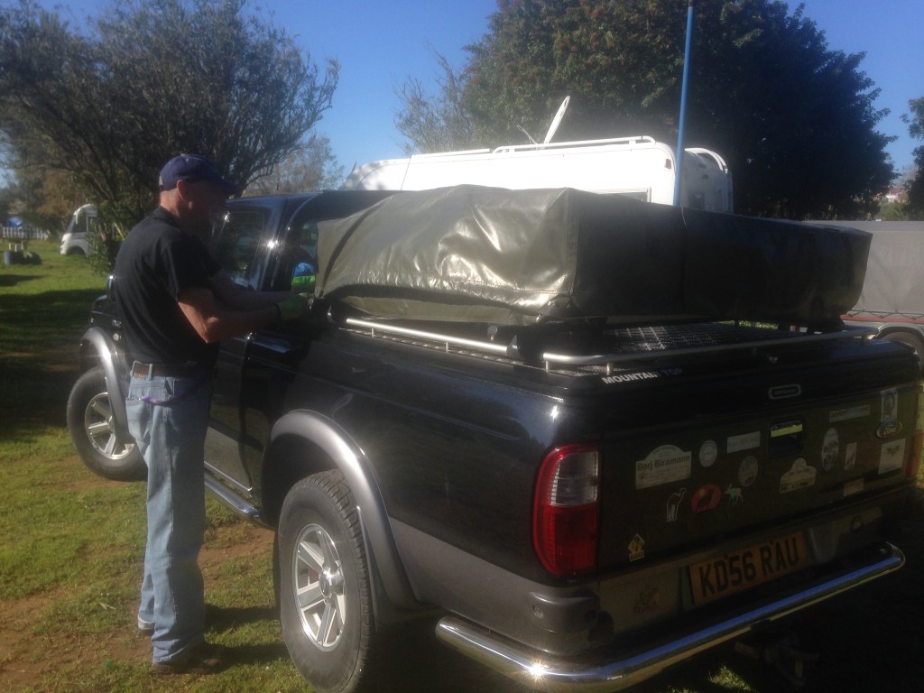 Well provisioned, we headed back to the campsite to prepare a feast. Now this guy had it all, a tent on top of his pickup truck, and in the bed of the pickup, under the base of the tent, was stored all his ‘essentials’, accessed by dropping the tailgate. Where we had a simple trangia to cook on, a plate and a fork each and a couple of penknives for food prep, he had the works. Out came a home made, three part bar-b-q, plates and cutlery galore and cooking pans of all descriptions. What his vehicle lacked in style, it more than made up for in substance.