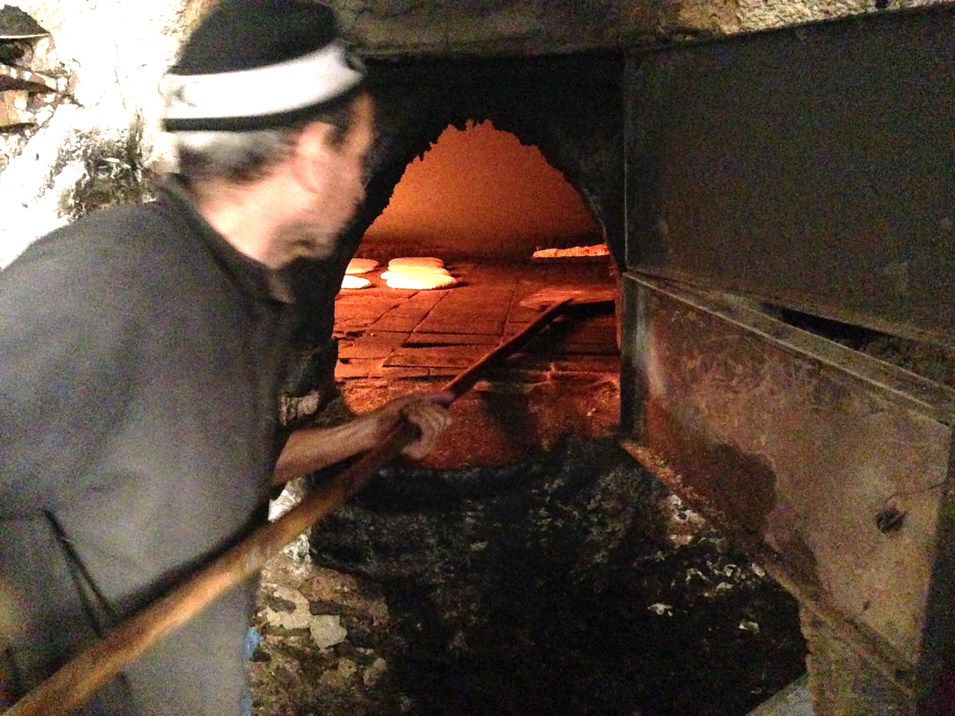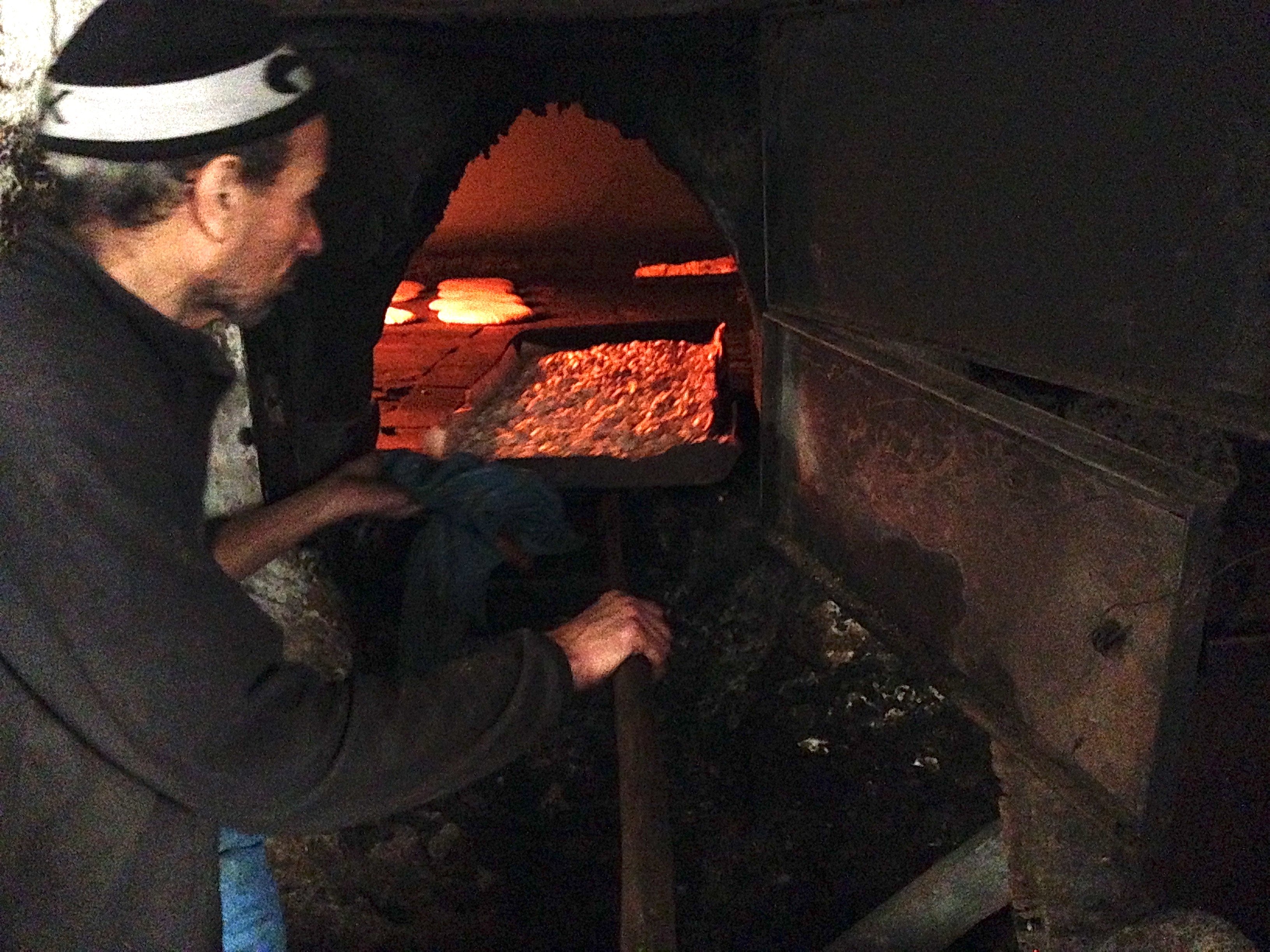 As my eyes adjusted, I was able to discern a wiry man crouched low on his haunches, on a grey, dust carpeted floor. He was wielding a very long handled peel, in front of a simple, gaping, wood fired oven. He deftly removed several flat round loaves of bread from the furnace, and placed them in a small number of baskets and trays that were on the floor behind him. Then he turned his attention back to the oven and began to move the embers about, making sure the base of the fire was clear of debris and ready to receive the next batch of bread. Our guide babbled on, explaining exactly what we were seeing. He need not have bothered. I knew what this was and I was transfixed. If I had ever bothered to write a bucket list, I now realised that this moment would have been right at the top.